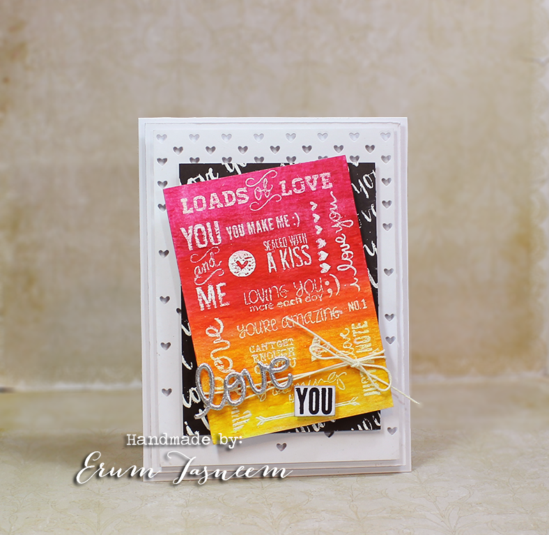 I used "I love you" to white heat emboss on black cardstock to make a contrasting layer.